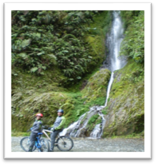 09:30 We start descending on an asphalted road (about 1 hour) riding on the right hand side, and make some breaks in safe areas to gather the group and take pictures. Arriving in Unduavi, we will have to register and pay the entrence fee to the Death Road Bs. 25. There are public toilets.